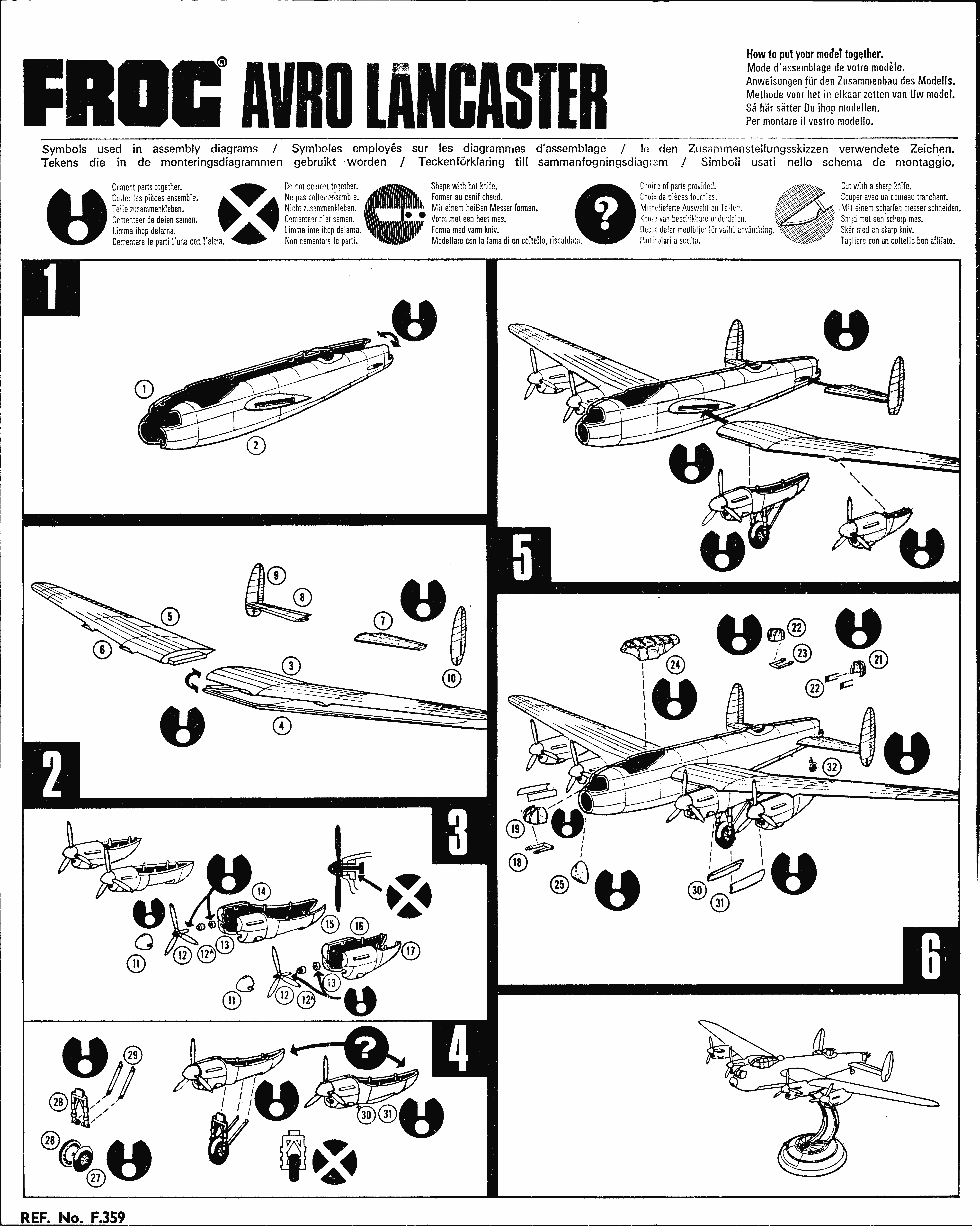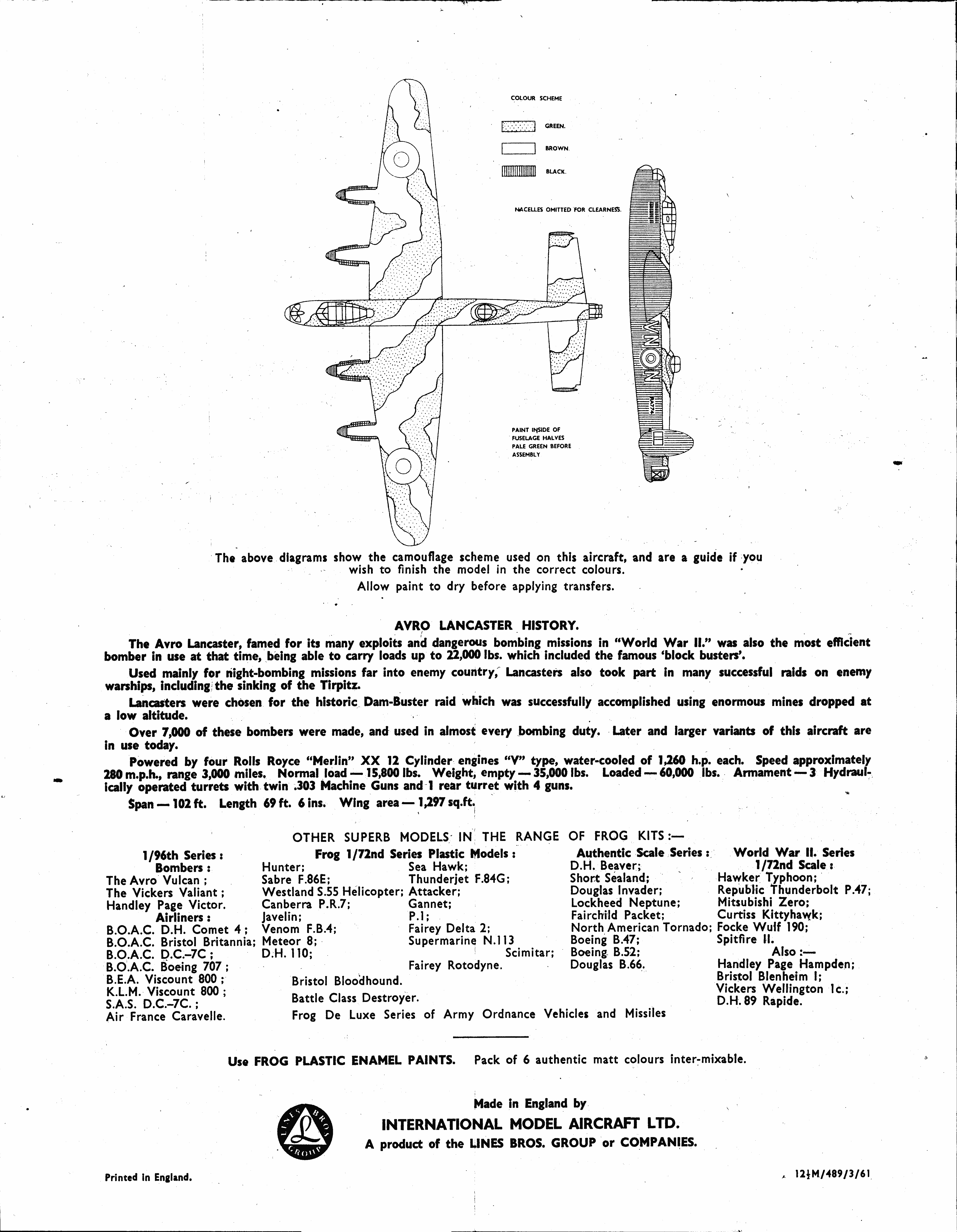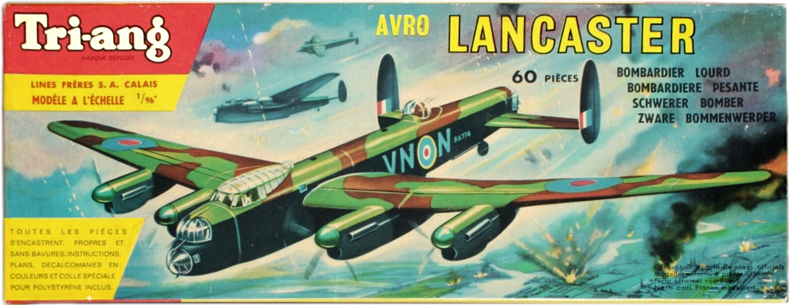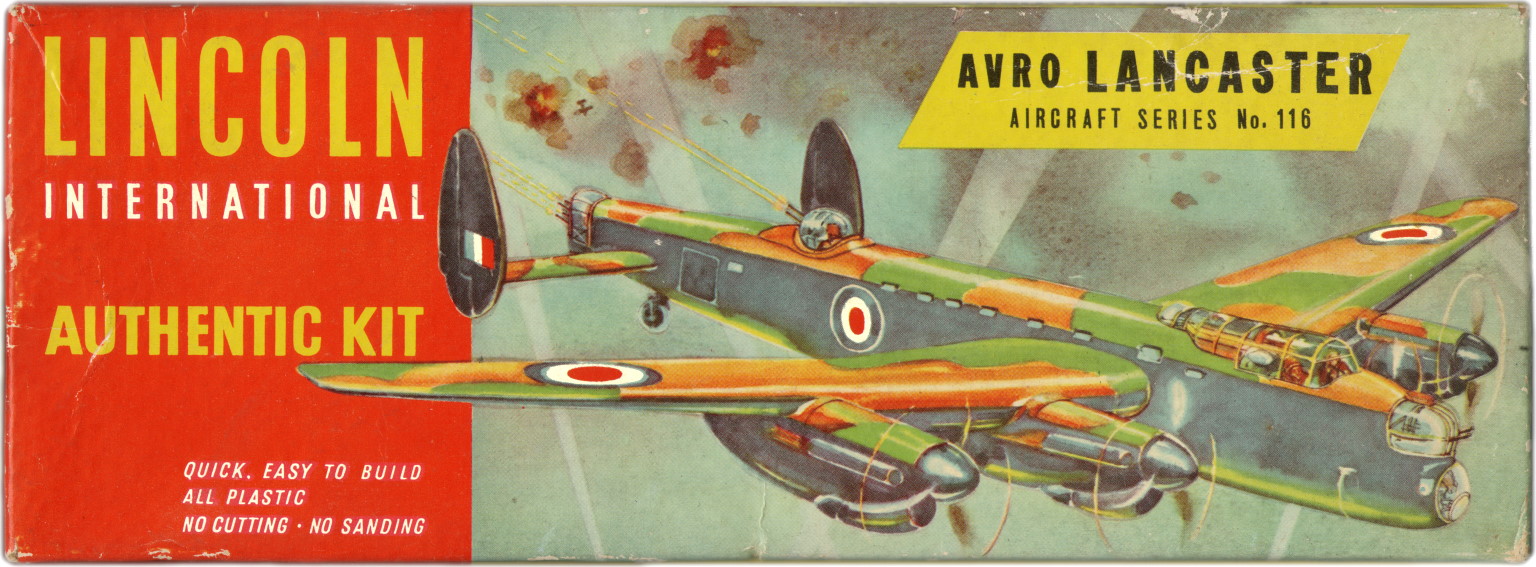 Ланкастер за 2 шиллинга 11 пенсов, анонс которого был опубликован на этой странице в прошлом месяце, теперь появился в каталоге Lincoln International. Это аккуратная, опрятная модель, хорошо отлитая, и собирать ее одно удовольствие. Ее размах составляет 9¾ дюймов, что соответствует масштабу примерно 1/125, и она имеет вращающиеся турели, подвижные элероны и убирающиеся основные колеса (хотя, к сожалению, вы не можете закрыть створки за колесами). В целом, эта модель является довольно хорошим соотношением цены и качества, потому что она имеет достаточно характерных особенностей "большого набора", но вам не придется платить за большой набор.
