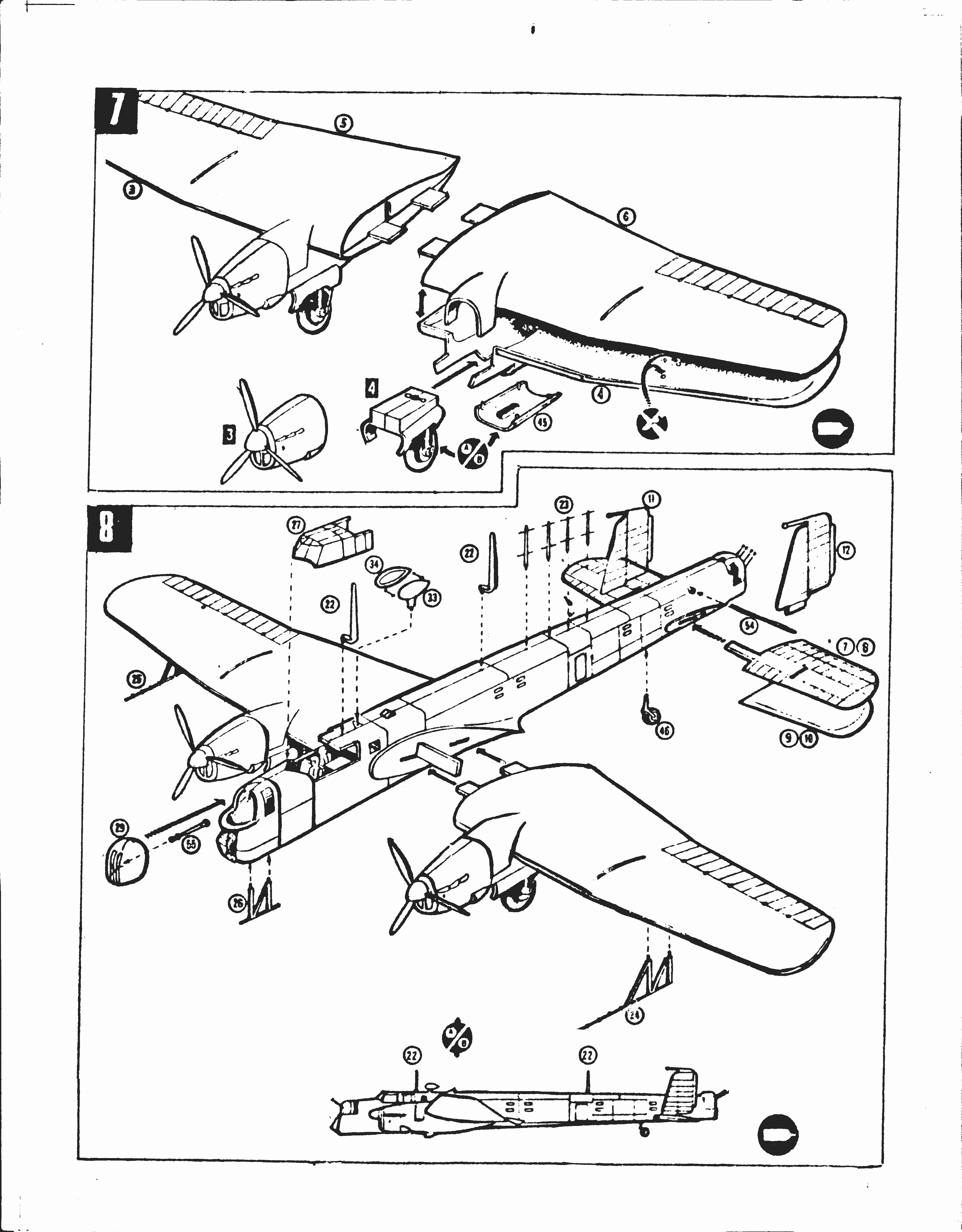 Frog оказались достаточно дальновидными, чтобы предоставить в качестве альтернативы бомбардировщику версию Mk. VII Берегового командования, которая была введена в эксплуатацию в качестве временной меры до появления таких машин, как «Либерэйторы» (и которая обеспечивала аппетитные мишени для Ju 88 над Бискаем в 1942-3 годах). Это предполагает установку антенн A.S.V. в верхней части фюзеляжа, под носом и под крыльями. Последние должны быть разнесены под углом, как показано на крышке передней коробки, а не выровнены по носу и хвосту, как в наборе; для придания реалистичности следует добавить настоящие поперечные антенны на этих стойках, подходящим материалом для которых может послужить плавкая проволока или тянутый литник. Боковые фюзеляжные антенны также должны быть сделаны для завершения самолета, оснащенного A.S.V. Отличный переводной лист прилагается для самолета Whitley V из 102-й эскадрильи, на котором Леонард Чешир, в то время P/O., вернулся из Кельна в ноябре 1940 года с большой пробоиной в борту, или Coastal Mk. VII из 502-й эскадрильи.