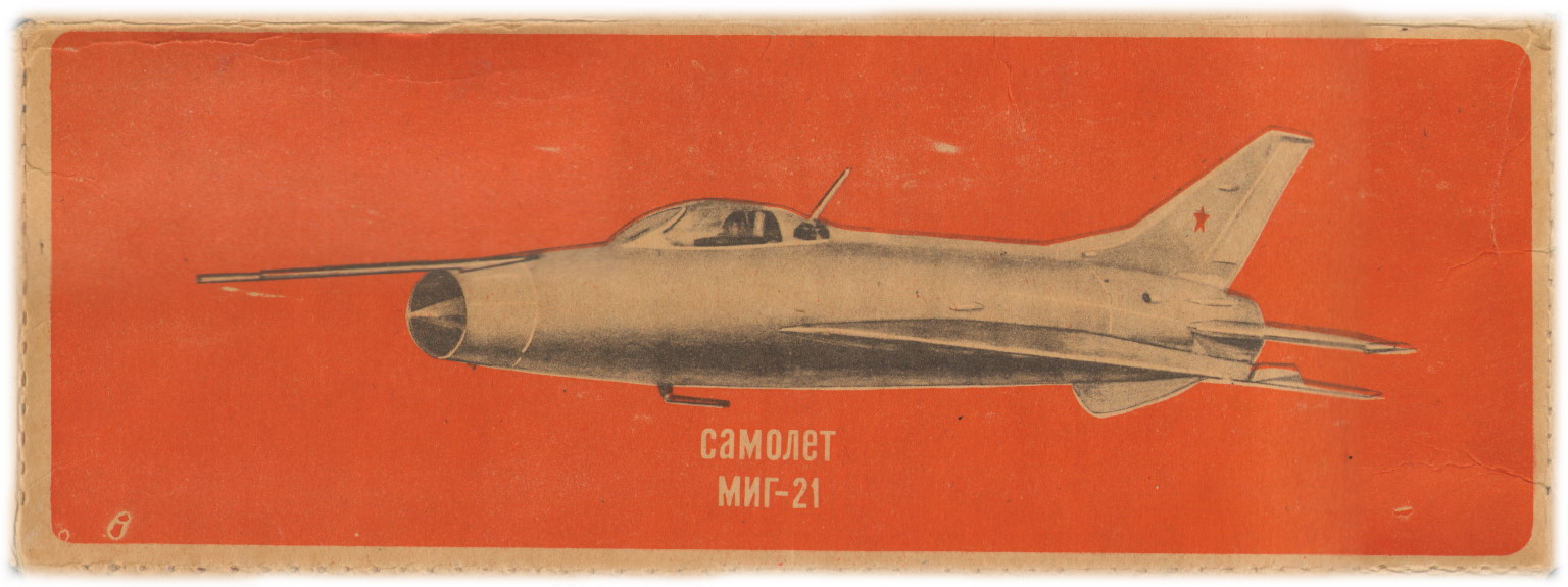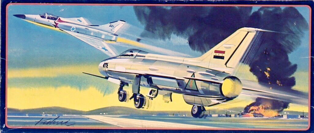 В качестве исходного материала для рисунков к коробкам моделей FROG художники нередко использовали фотографии. Иногда сюжет рисунка полностью заимствовался с фотографии, иногда лишь самолёт. В данном случае была использована фотография летящего истребителя МиГ-21Ф-13 индийских ВВС из широко известной официальной фотосессии. Художник усилил впечатление от перспективы, перенеся точку зрения ближе к самолёту и изобразив запуск ракет К-13, соответственно ему пришлось немного перерисовать хвостовую и носовую части самолёта. Индийские кокарды были заменены на красные звёзды и добавлен бортовой номер в стиле советских ВВС. На рисунке направление аэродинамического гребня на правом крыле МиГа нарушает выбранную перспективу и оставляет впечатление очаровательной корявости под стать модели.